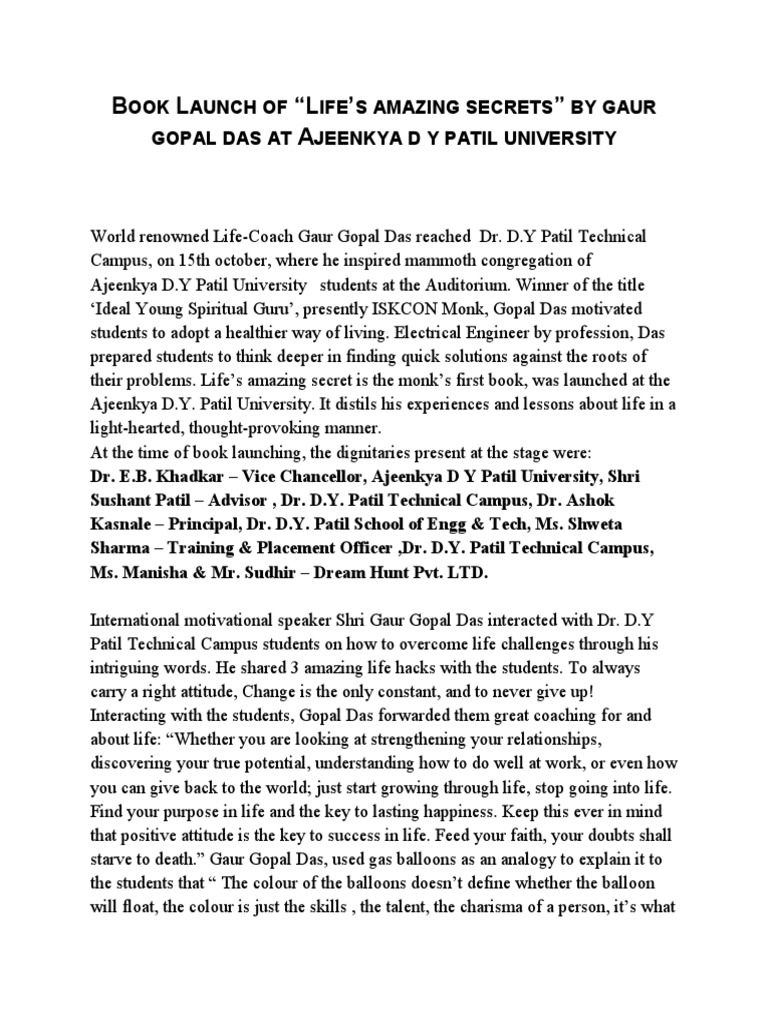 So whether you are looking at strengthening your relationships discovering your true potential understanding how to do well at work or even how you can give back to the world Gaur Gopal Das. Once Sir Winston Churchill was invited to give a talk and when he came in the stage the person who was meant to introduce him introduced him. BOOK LAUNCH OF LIFES AMAZING SECRETS BY GAUR GOPAL DAS AT AJEENKYA D Y PATIL UNIVERSITY.